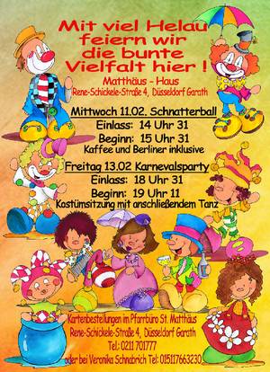 Kaum ist Weihnachten vorbei, schlägt wieder die Stunde der Jecken. Kommen auch Sie zu den Karnevalsfeiern im Matthäus-Haus. Wie immer gibt es ein buntes Programm und auch das leibliche Wohl kommt nicht zu kurz. Karten gibt es nach der Sonntagsmesse, im Pfarrbüro und bei Frau Schnabrich. Alles Weitere steht im